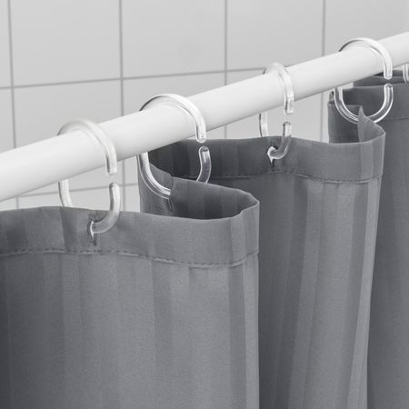 Изящная штора для ванной белого цвета из мягкой ткани крепового переплетения с обеих сторон украшена ткаными серыми полосами.