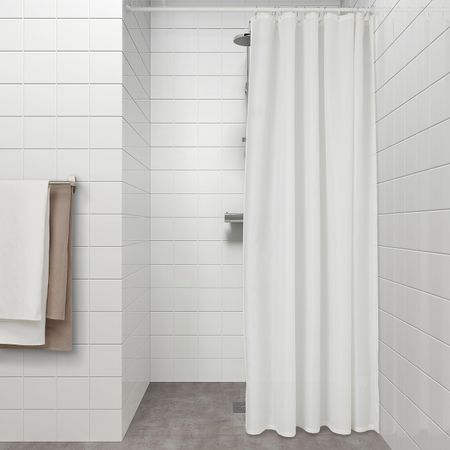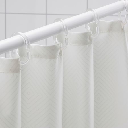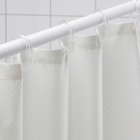 Белая штора с классическим ромбовидным орнаментом украсит ванную и сделает интерьер более стильным. Штора гармонично сочетается с другим текстилем. Для экономии сырья производится полностью из переработанного полиэстера.