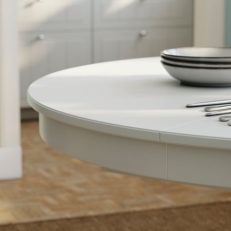 Круглый стол с плавными линиями создает в комнате располагающую атмосферу.