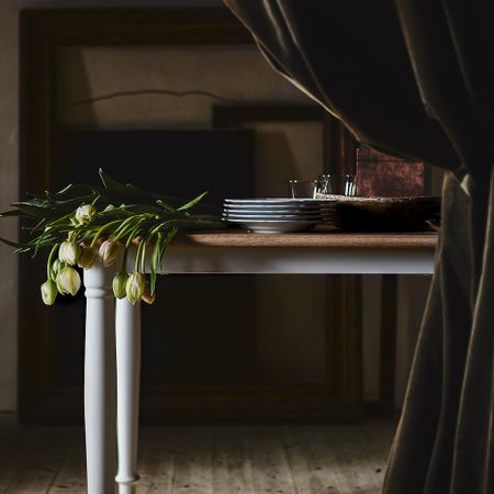 Столешница из шпона твердых пород древесины покрыта лаком и позволяет оценить всю красоту натурального дуба.Белые круглые стальные ножки в традиционном стиле имитирующие дерево, обеспечивают столу устойчивость и долговечность.