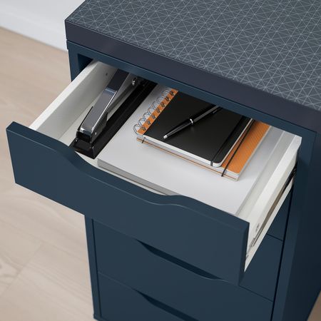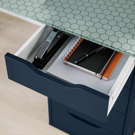 Тонкий геометрический рисунок придает столешнице выразительность, не утомляя глаза, когда вы работаете.С подготовленными отверстиями под ножки, легко собирать.Благодаря стопорам ящик не выпадает из каркаса.