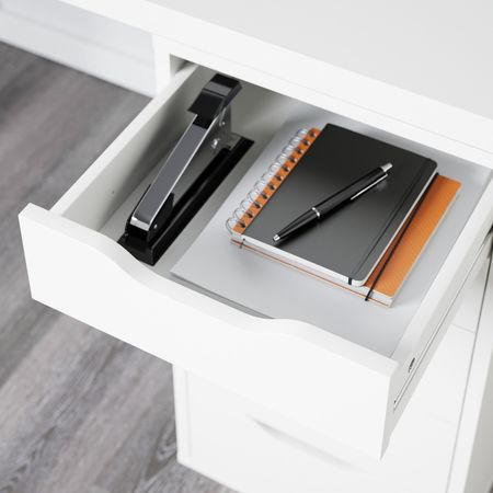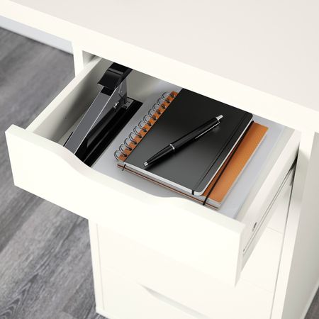 Благодаря длинной столешнице легко создать рабочее место для двоих.С отверстиями под ножки, легко собирать.Благодаря стопорам ящик не выпадает из каркаса.Благодаря лицевой отделке задней панели модуль можно поставить в центр комнаты.