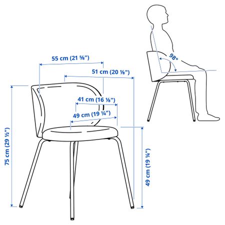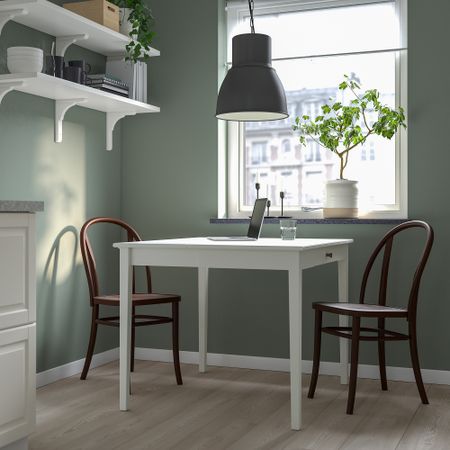 Меламиновая столешница устойчива к воздействию влаги и повреждениям и проста в уходе. Стулья без подлокотников можно придвинуть вплотную к столу, чтобы они не занимали место. Этот стул по комфорту ничем не уступает дивану.
