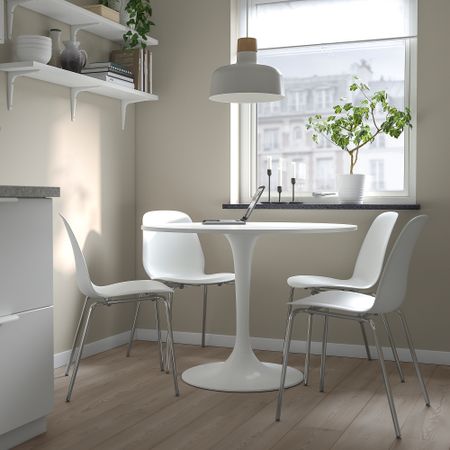 Компактный стол – идеальное решение даже для небольшого помещения. Устойчивый металлический каркас и прочная гладкая меламиновая столешница. Удобно сидеть благодаря эргономичной форме сиденья и закругленной форме спинки.
