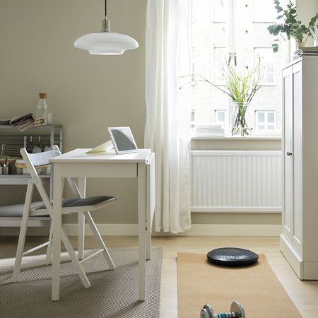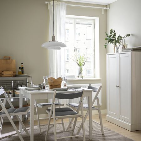Меламиновая столешница устойчива к воздействию влаги и повреждениям и проста в уходе. Обеденный стол с вкладной доской можно использовать для двоих, а можно раздвинуть, чтобы рассадить четырех человек. 1 вкладная доска прилагается.