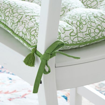 Можно использовать и в помещении, и на улице.Влагу после небольшого дождя или пролитую жидкость легко стряхнуть с водоотталкивающей ткани.Завязки фиксируют подушку на сиденье стула.Двустороннюю подушку можно переворачивать для равномерного износа.