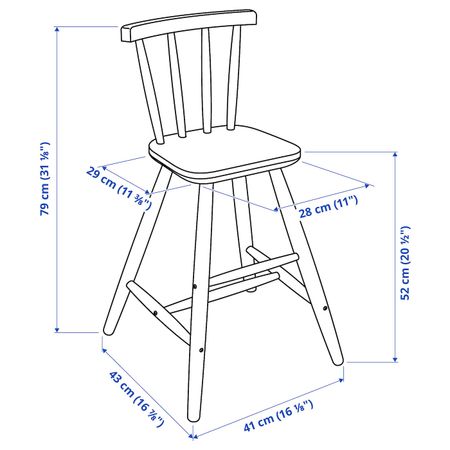 Сиденье находится на нужной высоте ребенку удобно сидеть за обеденным столом. Ширина: 41 смГлубина: 43 смВысота: 79 смШирина сиденья: 28 смГлубина сиденья: 29 смВысота сиденья: 52 см.