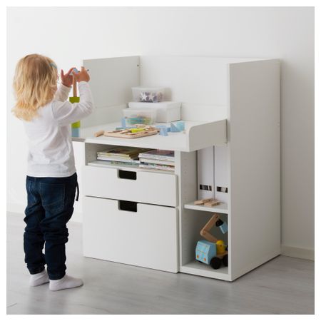Ширина: 90 см. Глубина: 79 см. Высота: 102 см. Пеленальный/письменный стол: Нижняя панель/ Боковая панель/ Перегородка/ Несъемная полка/ Панель: ДСП, Сотовидный наполнитель из переработанной бумаги, ДВП, Пленка, Акриловая краска, Пластмасса АБС. Размер: 90x79x102 см