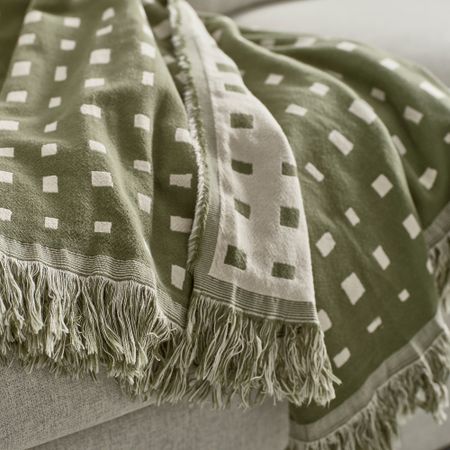 Ткань пледа изготовлена жаккардовым плетением, поэтому его декоративный орнамент виден с обеих сторон. Хлопок — натуральный материал. Ткань из хлопка проста в уходе, ее можно стирать в машине.