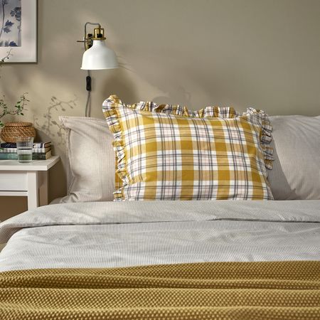 Наволочка PARKOLVON в классическую клетку с декоративной оборкой по краям преображает спальню, наполняя её уютом.