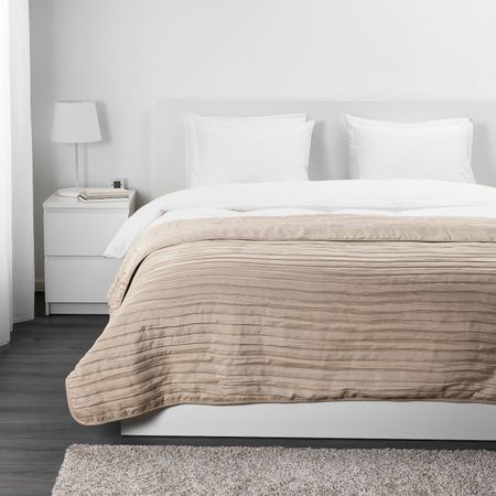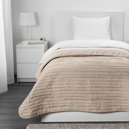 Складки на ткани придают фактуре покрывала выразительность.Полиэстерный наполнитель придает покрывалу особую мягкость.На кровати шириной 140 см покрывало будет свисать на 60 см с каждой стороны.