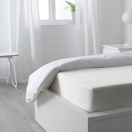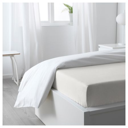 Плотная, прочная и мягкая ткань.Хлопок — мягкий и приятный на ощупь натуральный материал.Натяжная простыня на резинке подходит для матрасов толщиной до 26 см.Количество нитей на кв. дюйм: 152.