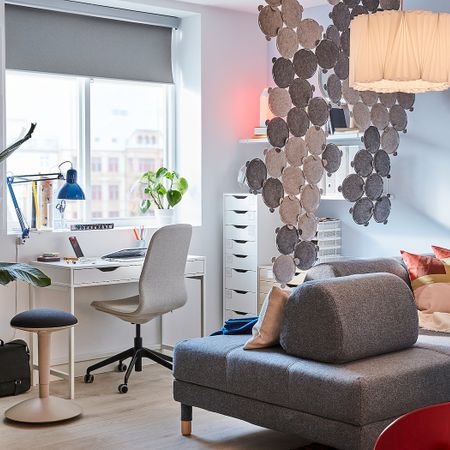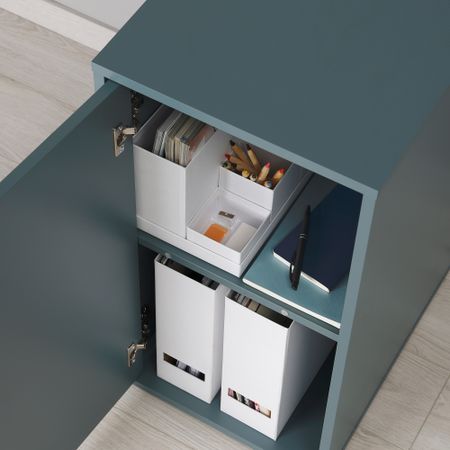 Благодаря отделке задней панели модуль необязательно ставить к стене. Прилагающуюся полку можно разместить на нужной высоте. Дверцу можно навесить справа или слева. Дополните модуль колесиками, чтобы без труда перемещать его по дому.