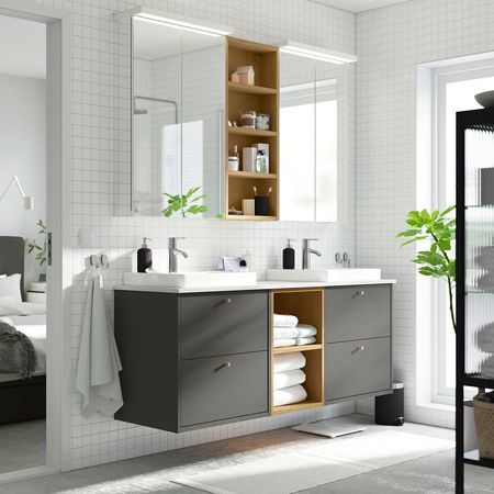Мебель для ванной ЭНГШЁН выглядит современно и лаконично с минимумом деталей.