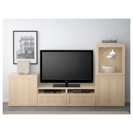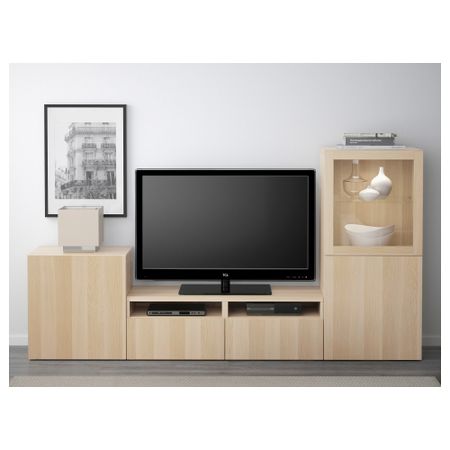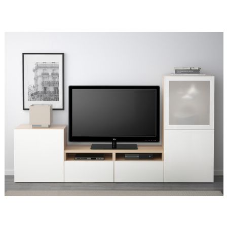 Шкаф для ТВ, комбинированный, стекляные дверцы БЕСТО, под беленый дуб, Сельсвикен глянцевый/бежевый матовое стекло (240x40x128