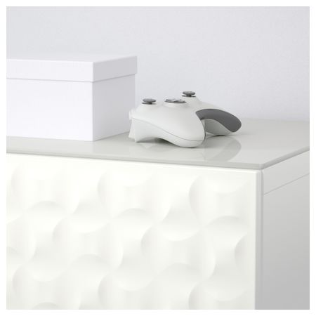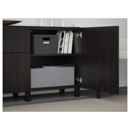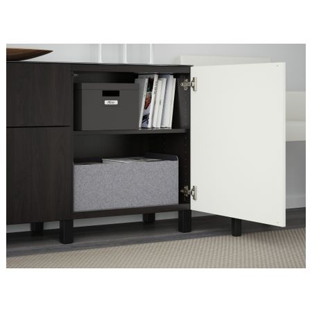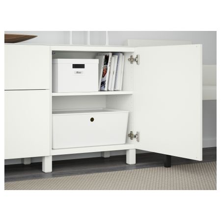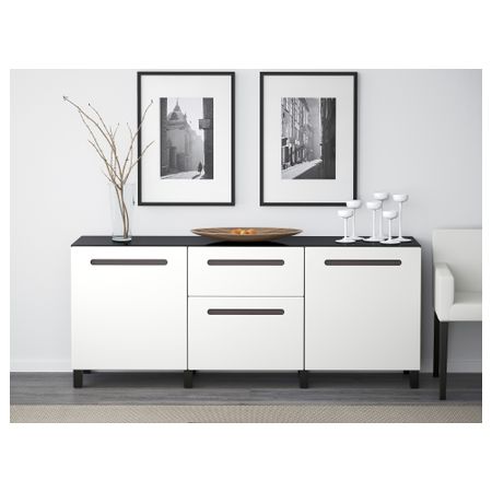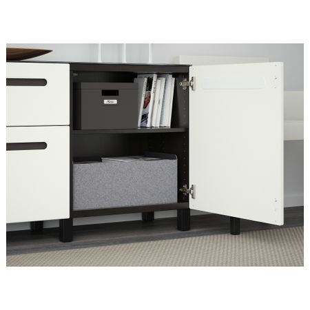 Закаленное стекло защищает верхнюю панель стеллажа БЕСТО и придает ему новый облик. Благодаря интегрированному нажимному механизму ящики и дверцы открываются легким нажатием. Ножки придают комбинации БЕСТО более легкий вид, поднимая модули на полом. Размер: 180x40x74 см