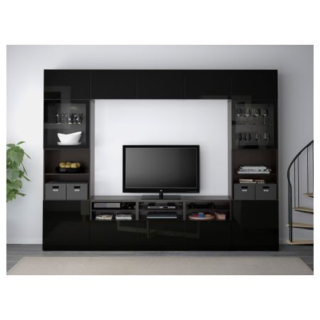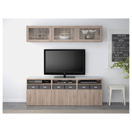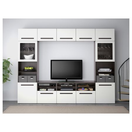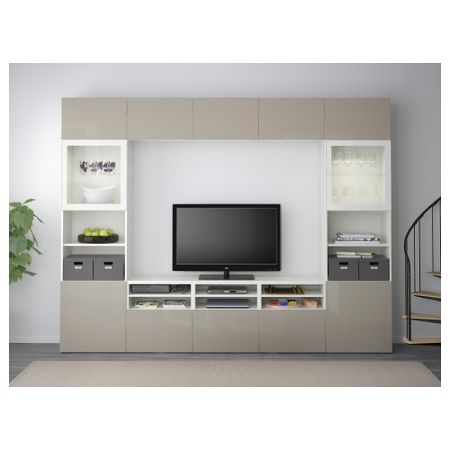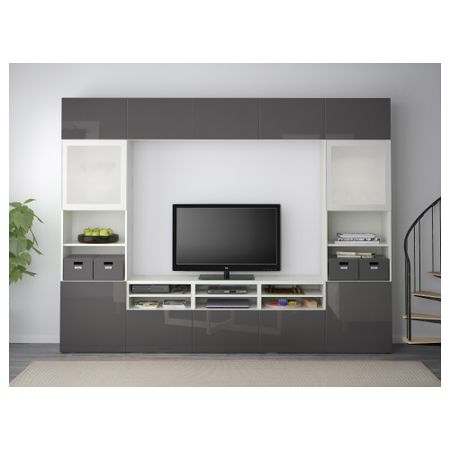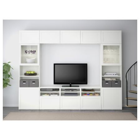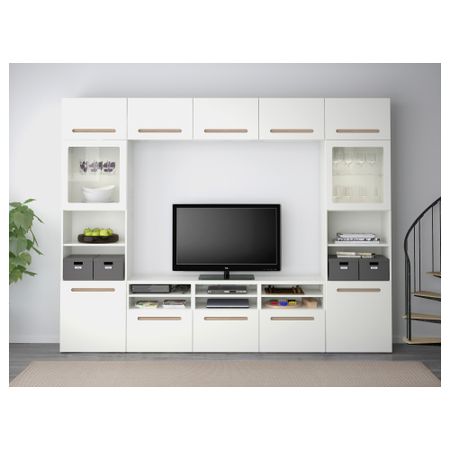 БЕСТО 590.880.91 Шкаф для ТВ, комбинированный, стекляные дверцы , белый, Сельсвикен глянцевый/белый прозрачное стекло (300x40x230 см)