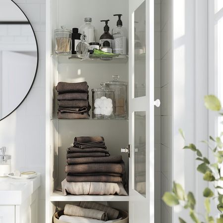 Используйте стеллажи серии ФРЁШЁН, чтобы оптимизировать пространство для хранения в ванной, подчеркнув традиционный стиль.