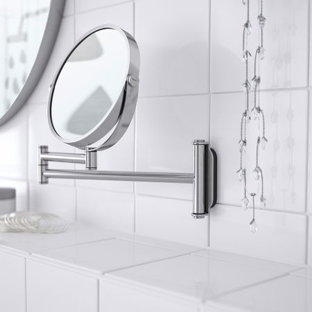 Увеличительное зеркало с одной стороны — очень удобно для косметических процедур, нанесения макияжа или бритья. Нет видимых шурупов, все крепления скрыты. Нержавеющая сталь — прочный и простой в уходе материал.