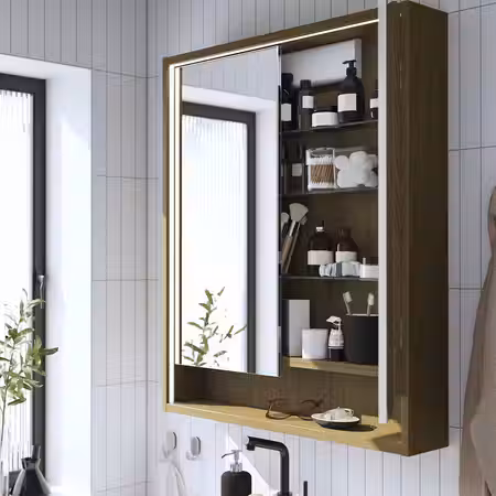 Этот зеркальный шкафчик очаровывает теплом дерева и встроенной подсветкой, которая наполняет пространство светом для утренних и вечерних процедур.