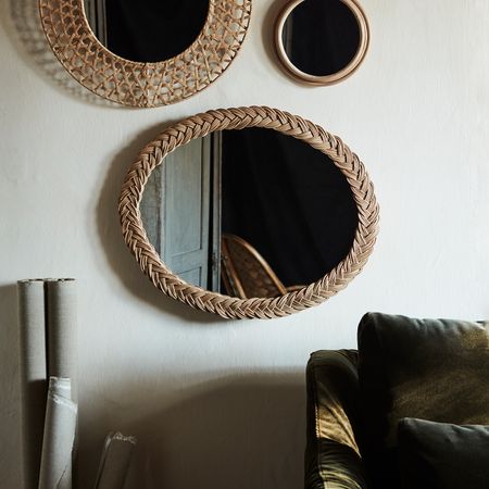Диаметр: 23 смГлубина: 2.5 см. Зеркальная часть: Стекло, Полимерная пленкаКаркас: Ротанг, Прозрачный лак
