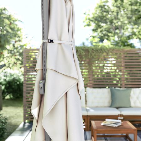 Регулируемый угол наклона зонта обеспечивает защиту от солнца в течение всего дня. Опора зонта от солнца изготовлена из алюминия, а значит, можно не беспокоиться о появлении ржавчины.