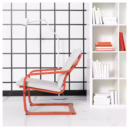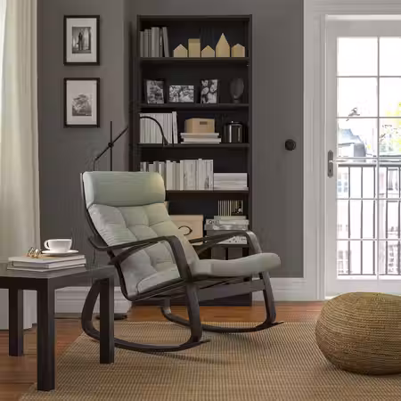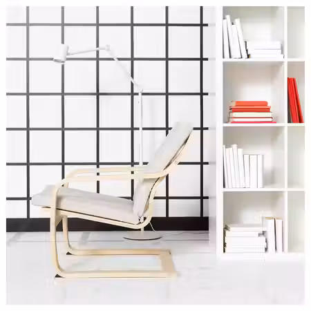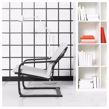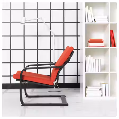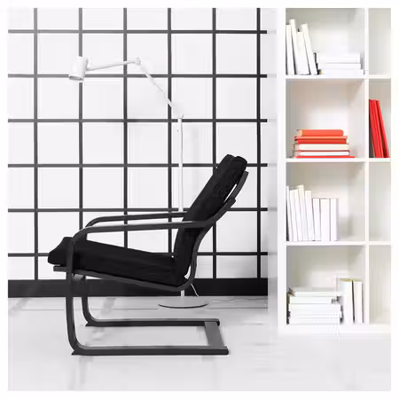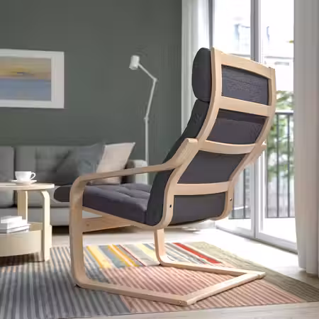 Кресло-качалка POÄNG со стильным каркасом из гнутой древесины обеспечивает поддержку шеи.