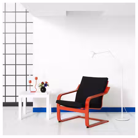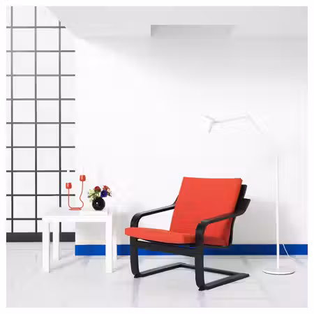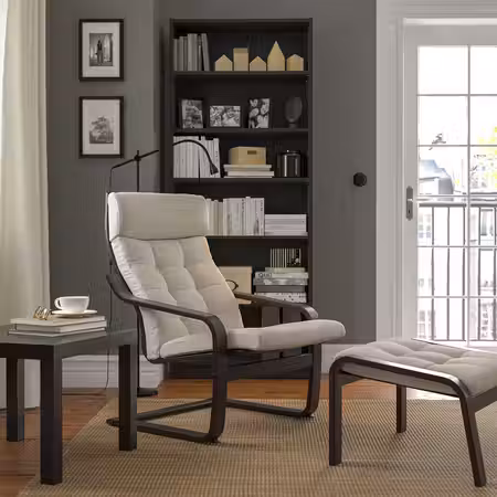 Кресло POÄNG со стильным каркасом из гнутой древесины обеспечивает поддержку шеи, а удобный табурет для ног позволяет отдыхать с комфортом.