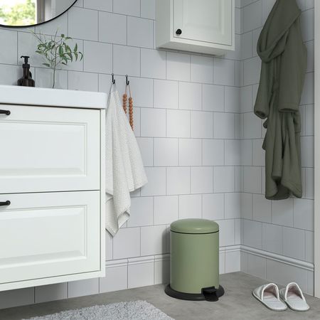 Небольшое мусорное ведро с откидной крышкой — отличный вариант для домашнего офиса или ванной комнаты.