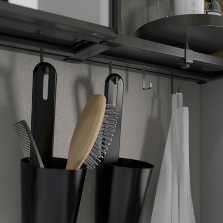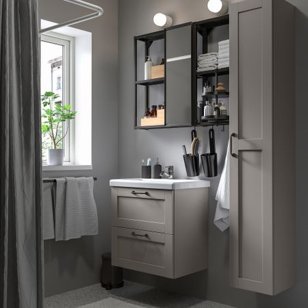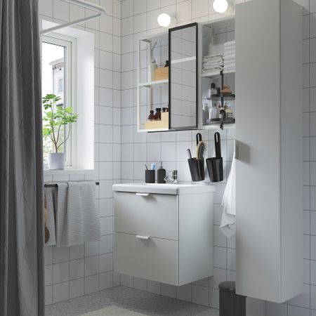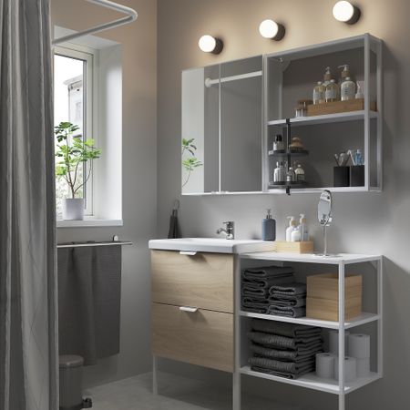 Эта комбинация предлагает гармоничное сочетание открытого и закрытого хранения, в котором можно разместить принадлежности, расставленные вокруг раковины. Зеркальный шкаф — идеальное решение для утренних процедур.