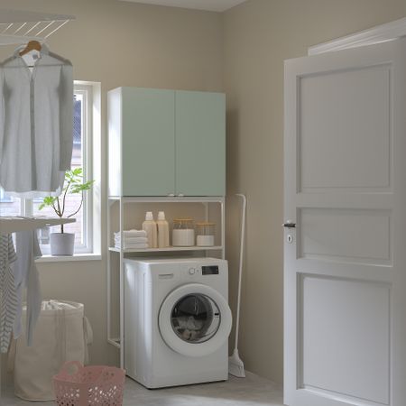 Аккуратное решение со специальным пространством для стиральной машины или бельевых корзин и вместительным решением для хранения сверху.