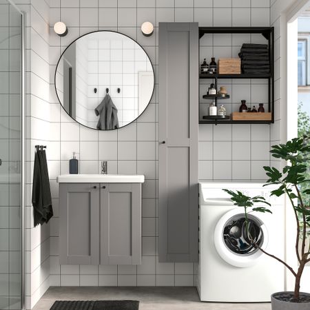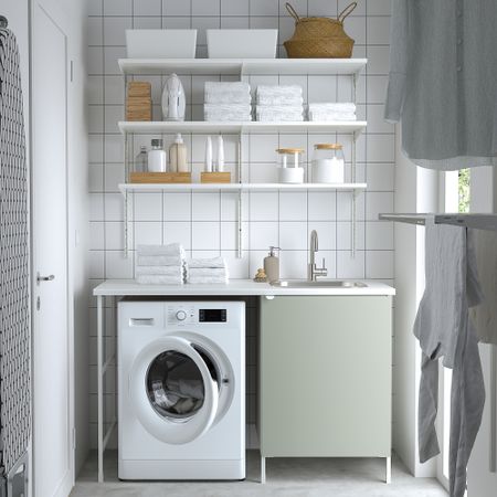 Практичное решение для обустройства рабочей зоны и специального пространства для хранения внизу. Мойка в зоне прачечной удобна для ручной стирки одежды. Кроме того, с ней удобно наполнять ведро и выливать грязную воду после уборки.