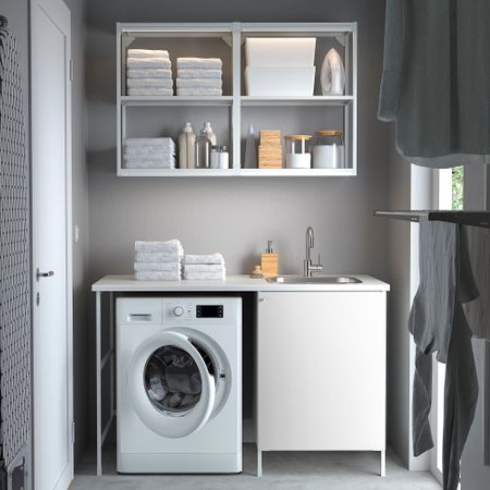 Это вместительное решение для хранения занимает совсем мало места. Аккуратно уберите вещи в навесные шкафы и закройте дверцы, а все предметы повседневного пользования оставьте на полках открытых каркасов.