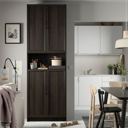 БИЛЛИ — это многофункциональный стеллаж, который можно использовать в качестве решения для хранения и для выполнения многих других задач в доме. Стеклянные дверцы защищают любимые вещи от пыли.