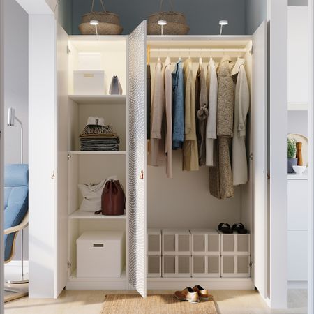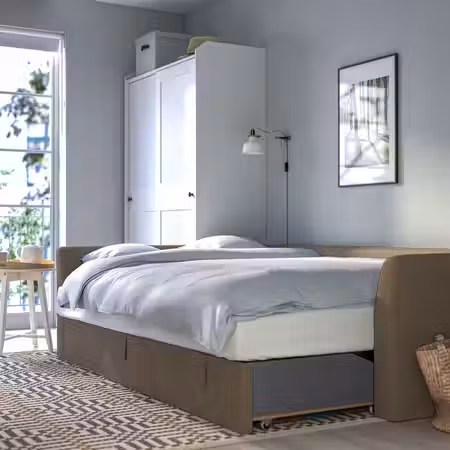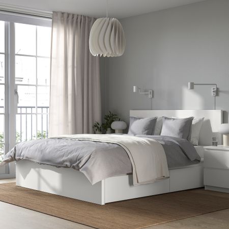 Четыре больших ящика превращают пустующее пространство под кроватью в практичное решение для хранения одеял, подушек и постельного белья. Благодаря колесикам ящики легко выдвигать и задвигать. Ящики МАЛЬМ подходят для каркаса кровати этой серии.