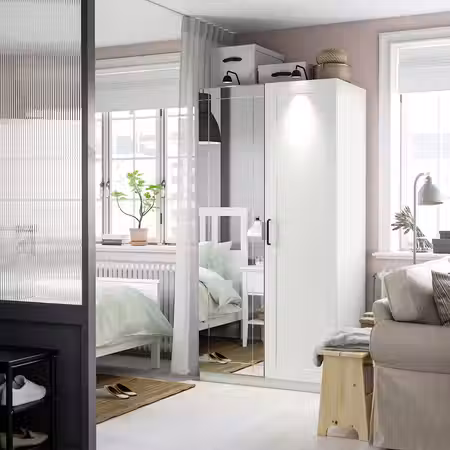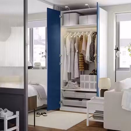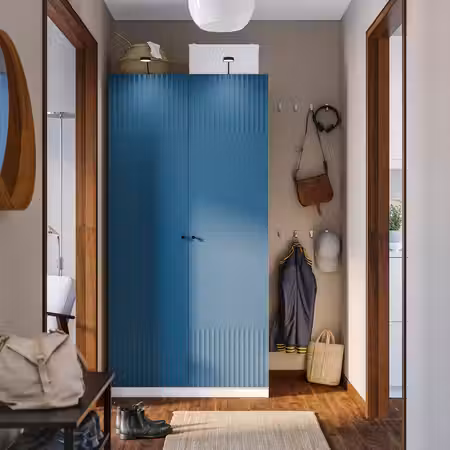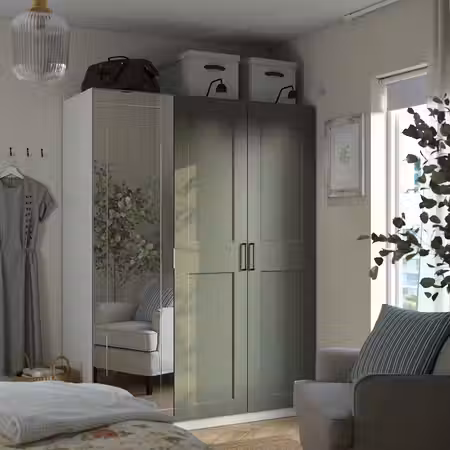 Добавьте к своему гардеробу PAX этот промежуточный модуль — в нём можно расставить красивые предметы и хранить любимую одежду и аксессуары. А с помощью стеклянных и деревянных полок с регулируемой высотой вы легко адаптируете пространство под