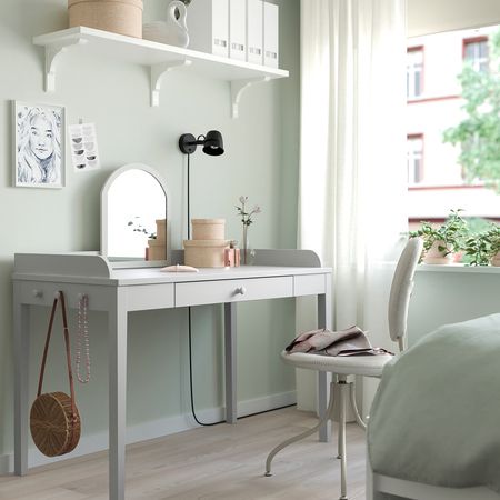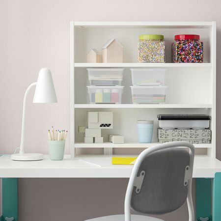С этой белой настольной полкой письменный стол ПОЛЬ растет в высоту.