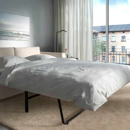 Можно дополнить подголовником ВИМЛЕ, чтобы сделать спинку дивана выше и обеспечить комфортную опору для шеи.