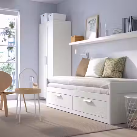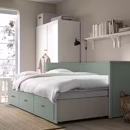 Эта кушетка легко превращается в двуспальную кровать, для этого нужно просто выдвинуть основание и положить матрас.