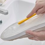 Маленькая щетка убирает следы грязи и пятна с поверхности обуви. На ручке есть скребок для удаления глины и других загрязнений, прилипших по краям, без риска повредить обувь.