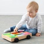 В набор входят 1 тележка на веревочке и 24 деревянных блока разных форм.