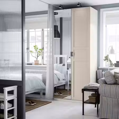 Если вы хотите дополнить каркас гардероба ПАКС раздвижными дверьми, высота потолка должна быть минимум 242 см.
