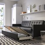 Этот диван легко трансформируется в двуспальную кровать, а в отделение под сиденьем можно убрать постельное белье, чтобы оно было под рукой и не создавало визуальный шум, когда диван не используется как спальное место.