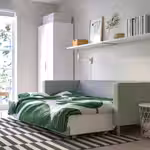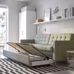 Этот диван легко трансформируется в двуспальную кровать, а в отделение под сиденьем можно убрать постельное белье, чтобы оно было под рукой и не создавало визуальный шум, когда диван не используется как спальное место.