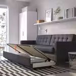Этот диван легко трансформируется в двуспальную кровать, а в отделение под сиденьем можно убрать постельное белье, чтобы оно было под рукой и не создавало визуальный шум, когда диван не используется как спальное место.