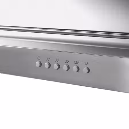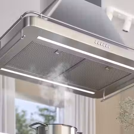 Вытяжка из нержавеющей стали с регулируемой светодиодной подсветкой станет эффектным акцентом над кухонным островком.