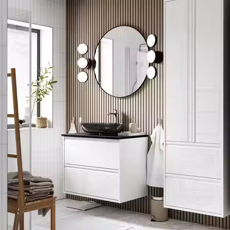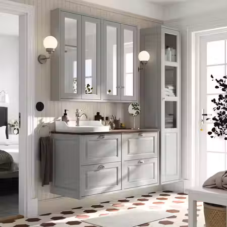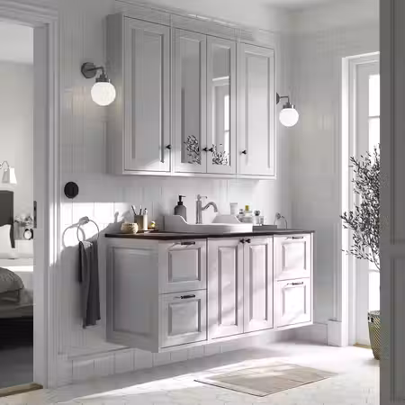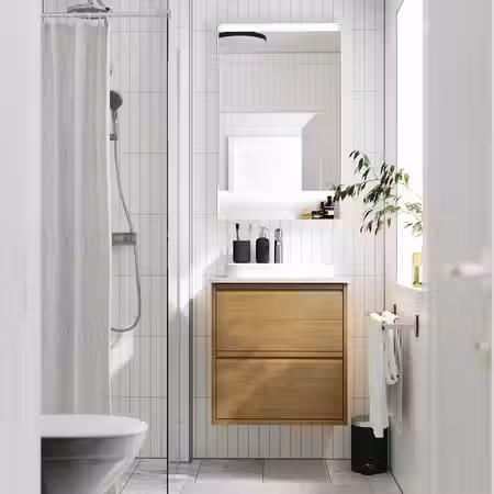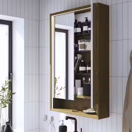 Этот зеркальный шкафчик очаровывает теплом дерева и встроенной подсветкой, которая наполняет пространство светом для утренних и вечерних процедур.