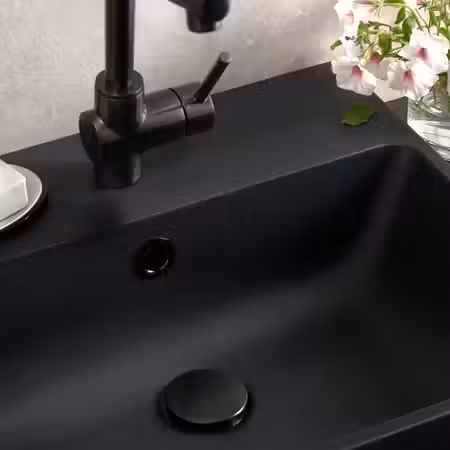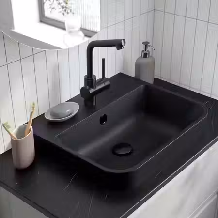 Полуутопленная раковина из мраморной крошки с элегантным современным дизайном привлекает внимание и освобождает ценное пространство на столешнице для нужных вещей.