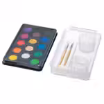 В набор входит: 14 красок разных цветов, палитра, лоток, 2 стаканчика для воды и 2 кисточки.