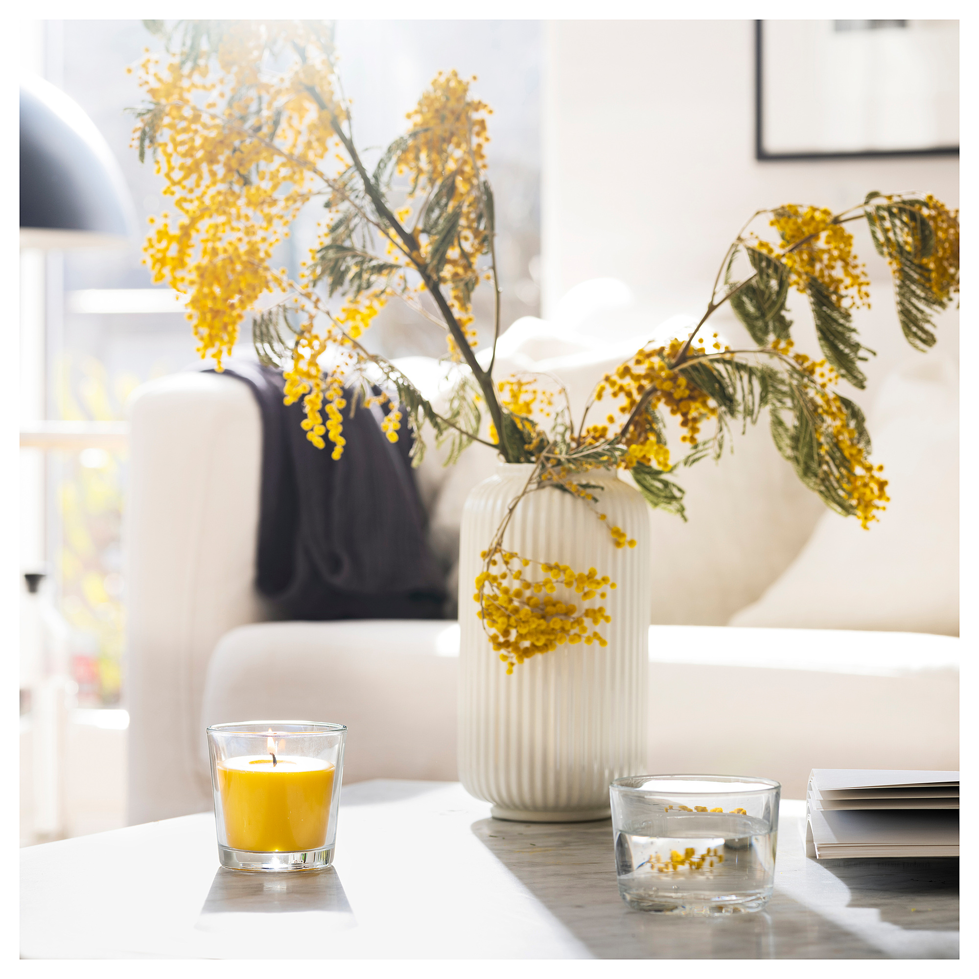 Особенности «SVARTOXBÄR ароматическая свеча в стакане, Мимоза, желтый, 25 ч» отмеченные производителем IKЕА: